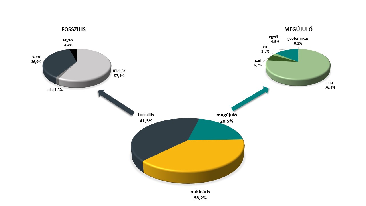 A 6/2008. (VI. 18.) KHEM rendeletnek megfelelően az MVM Next Energiakereskedelmi Zrt. mint egyetemes szolgáltató által 2023-ban az Ön részére értékesített villamos energia termelésére felhasznált elsődleges energiaforrások részaránya az alábbi diagramokon látható.